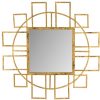 Bold geometric lines are softened with an artful gold foil finish in this dramatic 35-inch mirror designed for a light and airy look in transitional rooms. Forged of iron, each mirror is one of a kind, crafted with its own unique golden shading and tones. Care Instructions: Dust with a soft, dry cloth. Do not use abrasive cleaner. To clean mirror, spray a small amount of glass cleaner onto a lint-free cloth and wipe mirror clean. Disclaimer: Please note that this product is hand crafted by artisans, and none are exactly alike. Each item will have different shadings, patterning and variations in color.