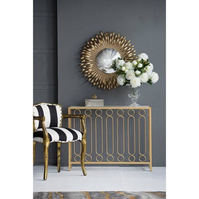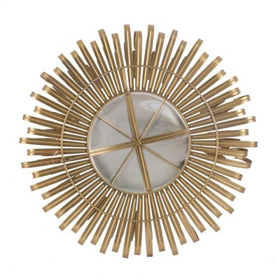 This 25.5″ Mirrored Sunburst Wall Decor offers a chic sunburst design in a crisp, golden finish that adds a dazzling look to any space. Hang it in the foyer to create a shimmering focal point or use it to complement an eclectic and artful gallery wall in the master suite. The gold finish provides an antique look. This mirror complements contemporary or transitional décor. This item belongs to a collection of items created and designed by A & B Home, a family-owned business founded in 1993. A & B home Is recognized as an international leader specializing in quality products with an innovative design for the home decor, furniture, garden, and seasonal product categories.