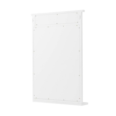 Bring style and organization to your bathroom. This collection works in a range of decorating styles- from traditional to modern with its clean lines and decorative side-element. Wood construction with a white, painted finish, these pieces are designed to maximize bathroom storage. This is the perfect mirror for any bathroom space. The mirror features beveled glass with a decorative wooden frame. An attached shelf is a perfect spot of your toiletries or decor. Bath collection is moisture resistant.