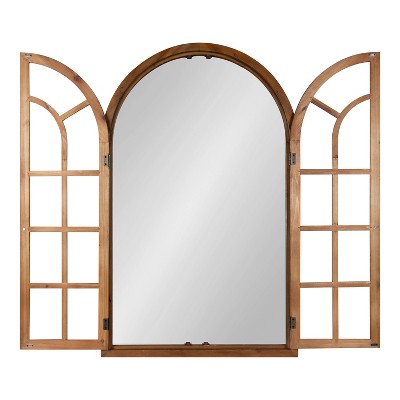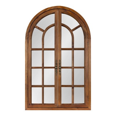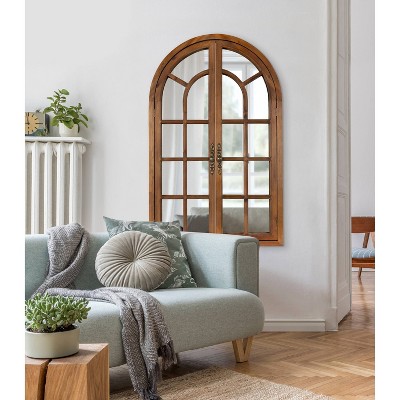 Decorate your home in a rustic farmhouse style with an impressive windowpane arch mirror. This sophisticated mirror carries a rustic yet timeless aesthetic to create a commanding focal point. The frame and interlay has a vintage wood look, while the windowpane design makes your room appear more open. The Boldmere adds radiance and balances a roomβs ambiance with its rustic aesthetic. It also includes wood doors to provide more surface area, opening up the reflective glass to be more functional. This wall mirror is ideal above a sofa, over a mantle, or for rooms in need of vibrancy. In entryways, bedrooms, or hallways, this arched mirror will create a stunning reflective window look. The Boldmere accent mirror surface measures 24.5 inches across and 40.5 inches high. The wall outer display dimensions are 28 inches across by 44 inches tall by 1.5 inches deep. Transform an ordinary room into a gorgeous, illuminated space by hanging this dramatic, beautiful mirror with metal D-ring hangers attached to the back.