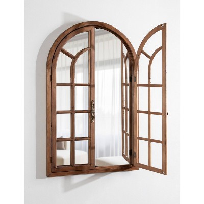 - RUSTIC DESIGN: This decorative mirror has a window-inspired design, with two decorative doors and a lovely rustic brown finish. It brings farmhouse style to your home