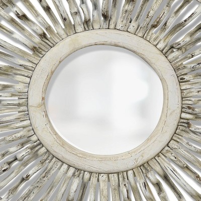 - The Circular Mirror Inner Frame Is Composed Of Mindi Wood That Is Also Finished In A White Washed Finish.