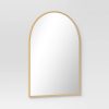 Add instant glamour and interest to your space with the Arched Steel Wall Mirror from Thresholdโข. This wall-mount mirror has a timeless rectangular silhouette with an arched top for added intrigue, and is encased in a gleaming gold metal frame for a touch of glam shine. This arched top wall mirror comes ready to hang with included mounting hardware and hanging template. Try adding this sleek mirror above a console table in your home’s entryway, or surround it with framed photos and art as part of a living room gallery wall.