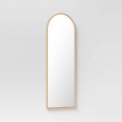 Add instant glamour and interest to your space with the Arched Steel Wall Mirror from Thresholdโข. This wall-mount mirror has a timeless rectangular silhouette with an arched top for added intrigue, and is encased in a gleaming gold metal frame for a touch of glam shine. This arched top wall mirror comes ready to hang with included mounting hardware and hanging template. Try adding this sleek mirror above a console table in your home’s entryway, or surround it with framed photos and art as part of a living room gallery wall.