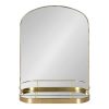 Indulge in a glamorous yet functional mirror that makes a beautiful statement on any wall. The Peyson wall mirror from Kate and Laurel offers a sophisticated arched shape and a glam gold finish to enhance its elegance. This fantastic accent piece has a frame made from a resilient and beautiful iron material, providing a robust display on your wall for generations. The Peyson mirror also includes a rounded and railed shelf attached to the front with 5.5 inches of depth, making it a fantastic area to house soaps, lotions, photos, small plants, and other keepsakes or household necessities. This mirror’s overall dimensions are 18 inches wide by 24 inches tall, making it an excellent bathroom vanity or decorative accent mirror. Adding a functional mirror to your home spreads light sources and makes your space appear more open and dimensional. The Peyson looks great in any modern living room, bedroom, bathroom, entryway, or dining room. Hang your new modern mirror in a matter of seconds with convenient keyhole hangers attached to the back of the frame.