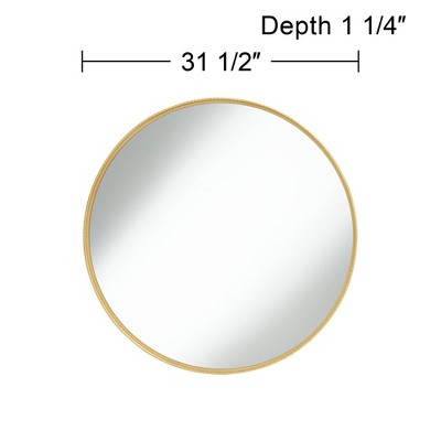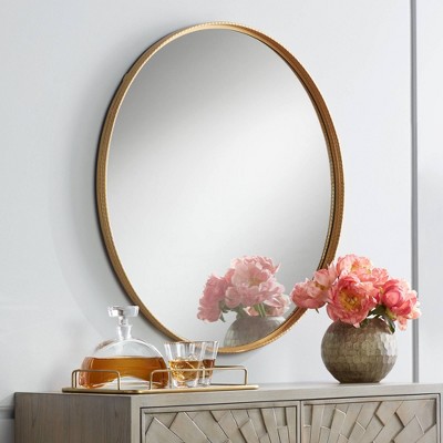Classic sophistication and style turn into a designer-friendly round shape that makes this metal wall mirror stand out. Perfectly transitional, this gorgeous mirror makes itself at home in contemporary, transitional, and traditional spaces. Offered by Noble Park, its gold finish frame encases non-beveled glass. An extra wide lip creates a dimensional effect.