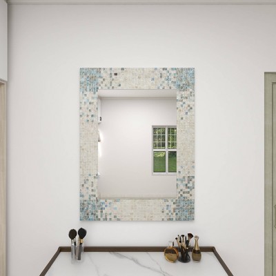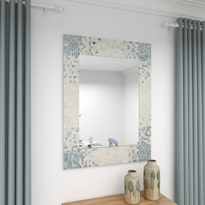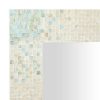 - A decorative wall mirror featuring rectangular frame with shell mosaic pattern