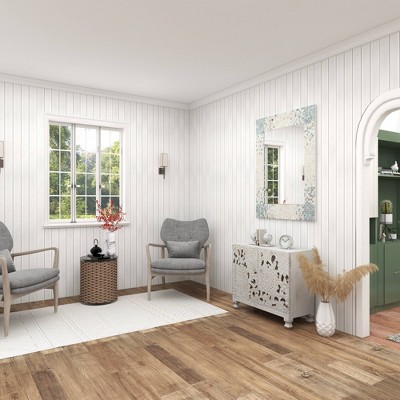- This wooden and mussel wall mirror sports gray and white finishes that suit light-toned interiors
