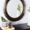 Magnificent miniature cymbals frame a perfectly polished oval mirror, making the Storm Mirror a dramatic, three-dimensional art piece. Lending a sense of depth and movement to décor, this eye-catching accent mirror is finished in brass antique coloring, giving Storm modern heirloom qualities. Care Instructions: Dust with a soft, dry cloth. Do not use abrasive cleaner. To clean mirror, spray a small amount of glass cleaner onto a lint-free cloth and wipe mirror clean.
