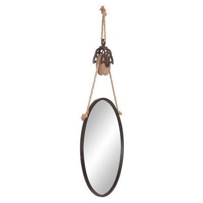 This rustic circle mirror lends clean, simple style with it’s vintage nautical inspired design. Measuring 24″ in diameter, the Round Metal Wall Mirror with Rustic Hanging Rope and Antique Pully boasts a circular frame crafted from iron in a matte black finish. Large porthole mirror features a natural jute 3 ply rope and antique inspired pully accent that adds ship-worthy style. Easily mounts to any wall surface with hanging rope which is braided 3 ply jute for extra security. It’s clean modern style and rustic accents make it a welcome addition to any home. Add it to the living room to brighten up an empty wall space or use it in the bathroom as a unique vanity mirror.