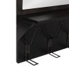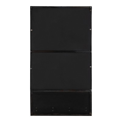 This framed mirror combines industrial chic home decor with functionality. Hang this mirror in your entryway for one last look out the door and to hold your keys, hooks, mail, or anything you need to remember as you leave the house. You can also hang this mirror in a bathroom and use the shelf for your make up our toiletries and the hooks for towels. This framed mirror is constructed of metal with a distressed black finish and has a 20 inch by 4.5 inch solid wood shelf. This mirror arrives completely assembled and ready for use. Two metal keyhole hangers are built into the back of the frame for easy and secure wall display. The outer dimensions measure 20 inches across and 36.5 inches high with a depth of 5.5 inches from the wall. The mirror surface is 18.5 inches wide by 27.5 inches high. The four hooks are spaced 5 inches apart from each other. This multi-functional wall hanging wall mirror is the perfect tool to organize to your home, kitchen, or entryway.