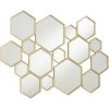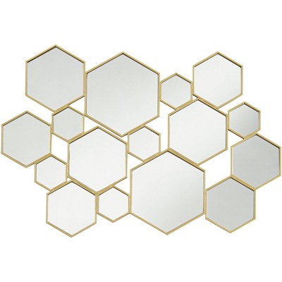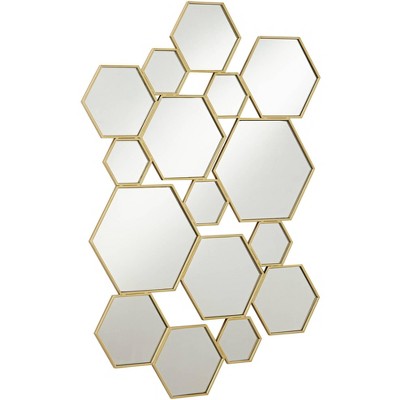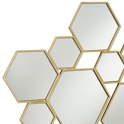 Contemporary design often borrows from iconic retro fare, and this modern multi-hexagonal wall mirror adds an indulgent multi-motif vibe. Infuse an energetic yet light mood with this mirror composed of joined hexagonal shapes formed of non-beveled mirrored glass. Lush gold painting finish over metal frames creates distinctive definition. This asymmetrical mirror brings lush, tasteful style to a hallway, bedroom, or main living space.