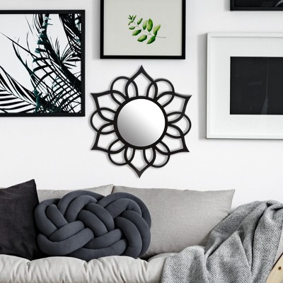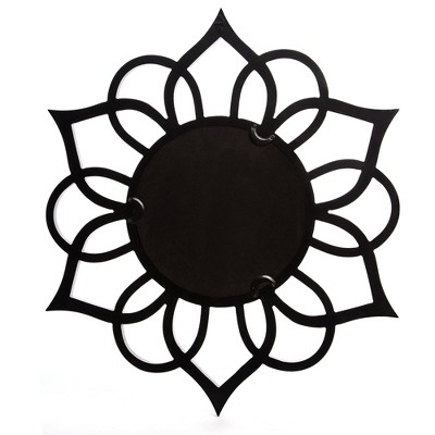 Flower-like in shape, this decorative 20 inch mirror is sure to make a statement in your entryway, kitchen, or bedroom. The mirror frame is intricately cut out of MDF and hand painted in a black finish, giving this mirror have a nice, sturdy construction. This mirror can be hung by itself or in a group of 2 to 3.