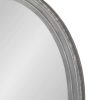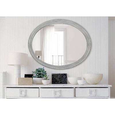 Make a bold and sophisticated statement on your wall with the transitional style of the Mansell decorative wall mirror. The oval-shaped glass mirror is bordered by a well-built, ornamental wooden frame that has a vintage, distressed look. Its distressed gray finish features a sloped transitional style and is made of durable, textured wood. Hang this lovely statement piece proudly over your vanity, dresser, shelf, or hang it as an accent piece in the living room, dining room, family room, or bedroom. The shape will be a great way to break up the straight lines of a gallery display or just the right size for smaller wall space. No matter the setting, it is sure to add a warm, charming visual appeal to your favorite living spaces. The outside dimensions of this oval mirror is 24 inches wide by 30 inches tall. To keep your installation simple, the Mansell wall mirror features metal D-ring hangers securely attached to the back of the wooden frame.