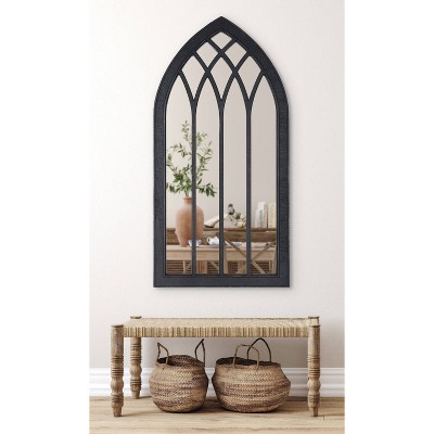The Kate and Laurel Winn arched mirror take inspiration from rustic architecture to create an eye-catching piece of decor unlike anything else. This accent mirror’s timeless design hearkens back to the gorgeous windowpanes of the Roman architectural renaissance, featuring a delicately placed overlay woven out of robust wood. Choose one Winn as a dynamic, bold focal point or purchase in multiples for a Palladian-inspired design aesthetic. This decorative wall mirror makes the perfect addition to any living room, entryway, or room with a need for more light and dimension. The generous size of 24 inches wide by 1.4 inches deep by 48 inches tall makes it a fantastic statement piece that will draw the eye and indulge the senses. Its bold black finish on the wooden frame gives it a more vintage appeal, with an intricately inlaid fretwork and arched shape that connects to vintage windows. The Winn windowpane wall mirror also includes metal D-ring hangers attached to the back that allow for a quick and easy installation process right out of the box.
