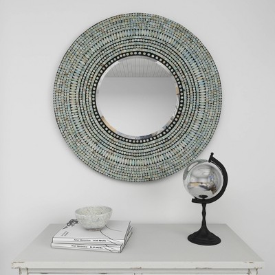 - This blue wall mirror flaunts a round shape with impressive mussel shell details