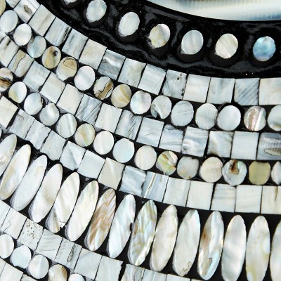 Add luminous coastal style to your space with this round shell wall mirror featuring natural freshwater pearl mussel shells. The round MDF frame has a black finish with the inlaid round, square, and oval shells in several rows wrapping around the interior mirror. This accent decor is ready to hang in your bathroom, bedroom, living room, or entryway by the sturdy D-ring hardware in the back. Suitable for indoor use only. This item comes shipped in one carton. Made in Vietnam.