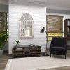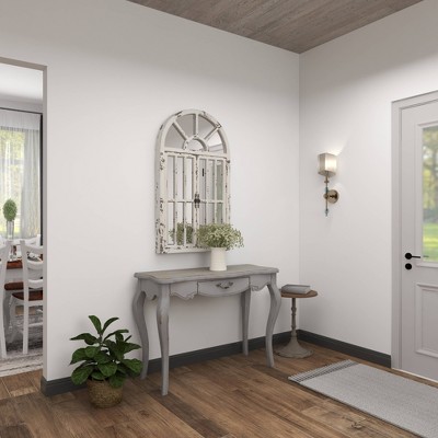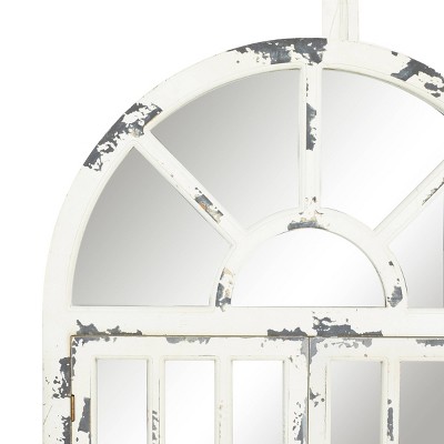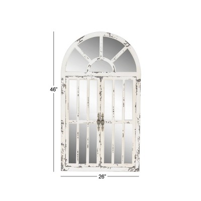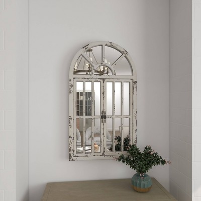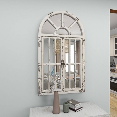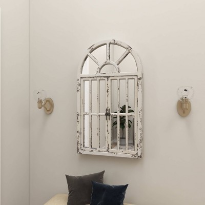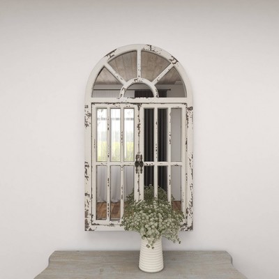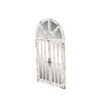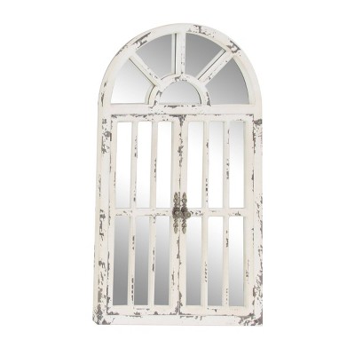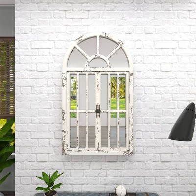 Add some style to your entryway, lobby, living room, or bedroom with this striking windowpane wall mirror. This accent piece features an arched window frame along with a distressed white finish and exposed chipping details. It is designed with rectangular panes and ornate metal handles. With its impressive look, this stunning mirror suits any home with vintage or farmhouse interior design. Apart from decorating your home, the purpose of this mirror is to bounce back outdoor light to a small room to make it look bigger. Pair this decorative wall mirror with house plants or other wall decor accent pieces to blend everything together perfectly. Ready to hang with attached D-ring hardware. Suitable for indoor use only. This item comes shipped in one carton.