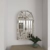 - This arched oversized wall mirror features a reflective glass finish and a distressed white and gray wooden finish