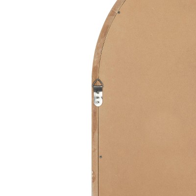 - Two ornate metal handles, designed with a clear reflective mirror center and two rectangular panes, this wall accent features an arched window frame design