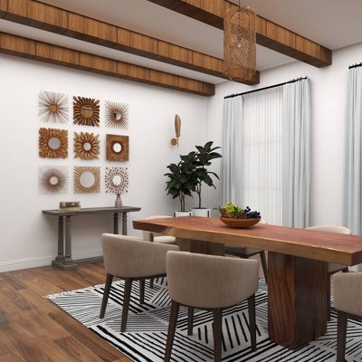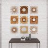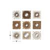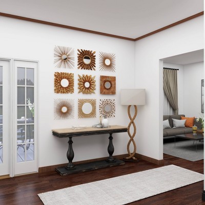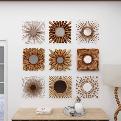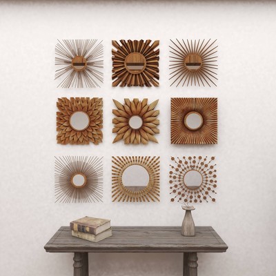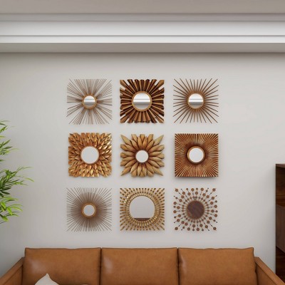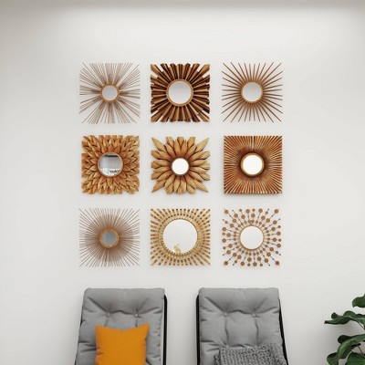 Bold, dimensional set of 9 square metal wall mirror wall decor pieces with a dark gold finish. Metal construction with a variety of geometric patterns, floral designs, and starburst shapes, all with round reflective glass mirrors inside. Hang separately, side by side, or in 3 rows to create one large textural, eclectic wall art section in your foyer, living room, dining room, or any space that needs an earthy, artsy touch. Easy to hang by keyhole hardware. Suitable for indoor use only. Each set comes with 9 gold starburst wall mirrors. Rustic theme. This item comes shipped in one carton.