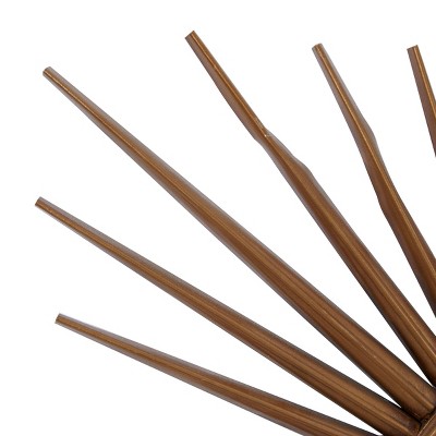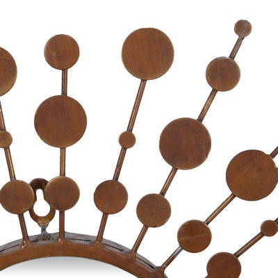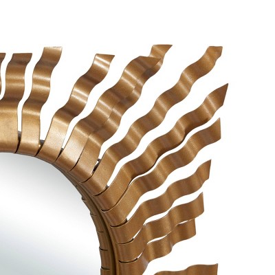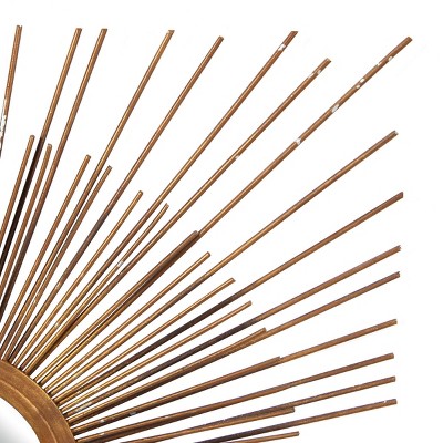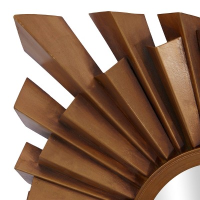 - Each rustic metal and wood wall mirror has round reflective glass and starburst-patterned frame