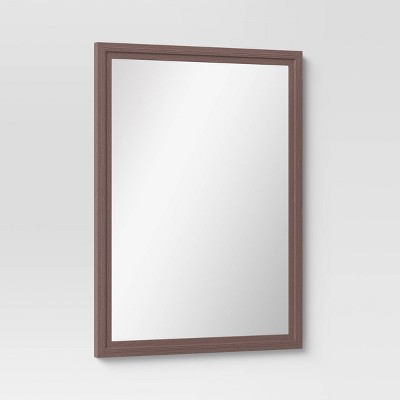 Style your walls with this Walnut Decorative Wall Mirror from Threshold™. This rectangular wall mount mirror makes a decorative and functional accent anywhere in your home. It features a recessed glass center to create the illusion of extra space, and a grooved walnut frame for an easy-to-coordinate look. Use this piece as a functional vanity mirror or as an accent above the sideboard or console in your entryway or living room to decorate your space.
