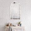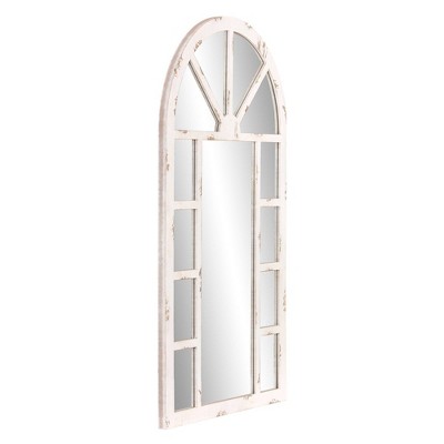 This gorgeous wall mirror brings character and elegance into any decor. Hand crafted from solid wood, this oversized mirror makes for a classic statement piece. Hang it securely on a wall with two industrial strength hangers on the back or lean it up against a wall above a mantel. Mirror measures 40 inches high x 23.75 inches wide x 1 inch deep. Frame is finished in an elegantly distressed white finish for a vintage feel and measures 1.4 inches wide. It’s cathedral inspired arched design will brighten any room and create the illusion of a larger space.