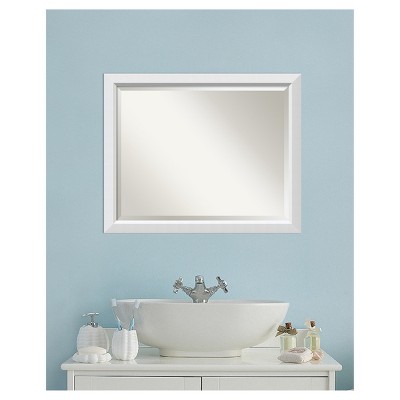 Give your bathroom the finishing touch with this 100% real wood framed wall mirror sized to fit above a standard bathroom sink. The outer dimensions of this mirror will work with a countertop up to 30 inches wide if hung vertically and up to 36 inches wide if hung horizontally. The mirror features a geometric white frame with a flat face, angled inner edge, and a smooth satin finish. Amanti Art is headquartered in Madison, WI, and provides high-quality, handmade framed art, mirrors, and organization boards for your home improvement projects. Our home decor products are made using traditional custom framing techniques that give you the kind of quality you’d expect from your local frame shop. Because of our focus on workmanship, our products are used by architects, developers, interior designers, and homeowners alike to create beautiful functional living spaces.