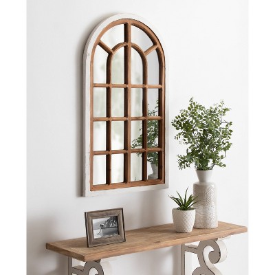 Create a rustic, farmhouse aesthetic within your home with the Boldmere Rustic Accent Mirror. This mirror has a distressed white and brown wood frame with an interlocked wood pattern in the front. Inspired by traditional vintage windowpanes, this accent mirror is a decadent feature to hang in your living room, bedroom, entryway, dining room, or even your master bathroom. Adding an accent mirror opens up your space and brings dimension and light to your home. This is a more compact version of our original Boldmere Mirror, standing at 38 inches tall by 22 inches wide by 1.25 inches deep. This is an excellent size for featuring your new mirror over a console table or other furniture. You can also mount it over a mantle, over a couch or love seat, or in multiples over your nightstand. This shabby-chic mirror is an excellent opportunity to purchase multiples for a symmetrical, dynamic wall display. Hang the Boldmere Mirror in only a matter of seconds with metal D-ring hangers, creating an excellent piece of home decor in a matter of seconds.