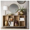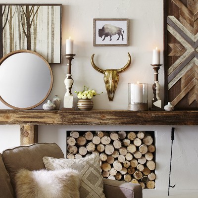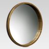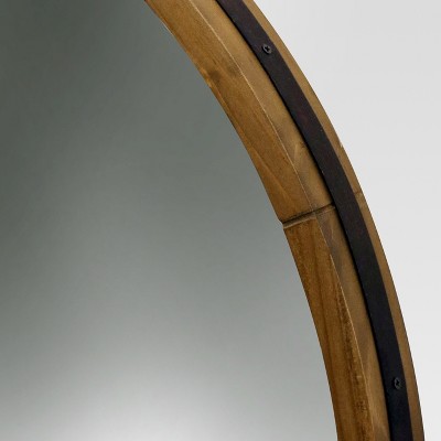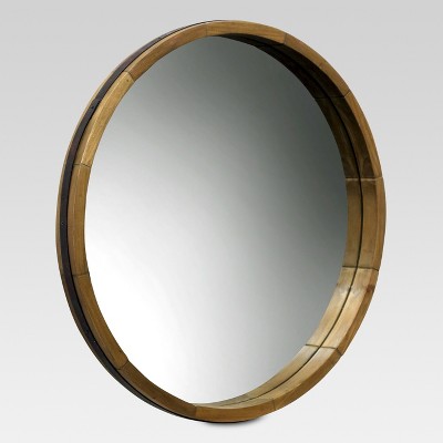 Inspired by wine country decor, the Round Decorative Wood Barrel Frame Wall Mirror from Thresholdβ’ adds a lovely accent to any room. Made with a wood barrel frame with a warm honey finish, it exudes rustic charm, and it can be mounted on any wall to give you a look at your reflection as you pass. Plus, the simple design and brown wood frame of this decorative mirror make it pair easily with any existing decor.