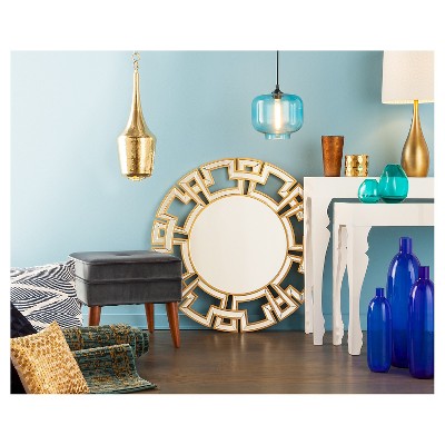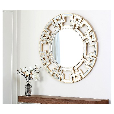 Give your home a little gleam and glam with the with the Abbyson Kaydence Round Mirror in Light Gold. This round wall mounting mirror makes a stunning focal point in any room, with its intricate geometric border and lustrous metallic trim. Easily blend this gold wall mirror with any design scheme and decor. A functional work of art, you will love looking at this unique and gorgeous mirror every day, and the way that it brightens up the room. Measures 35″x 35″ x 0.8″.