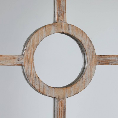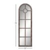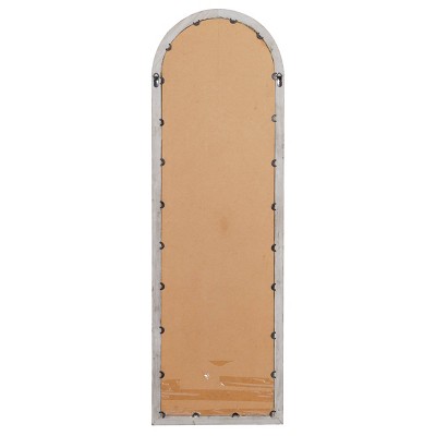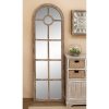 A large floor mirror bounces back outdoor light to a small room to create the illusion of a bigger space. This cathedral type accent mirror complements narrow vintage-inspired entryways, country cottage bedrooms and hallways, and transitional spaces between coastal themed rooms. It carries a distressed wood design that doesnβt look too run downβjust enough to give a natural and coastal style. The lightweight and durable materials make up for its oversized antique look. This item hangs vertically via triangle ring hardware. Suitable for indoor use only. This item comes shipped in one carton.