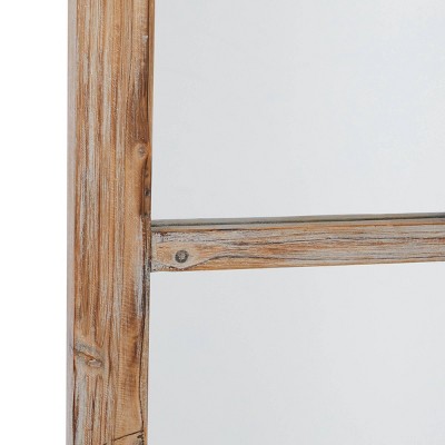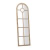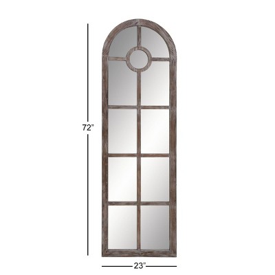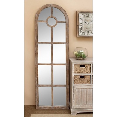 - This window pane arched floor mirror carries a whitewashed brown picture style frame in a vertical display