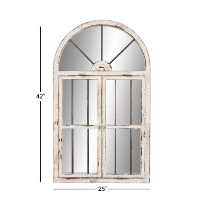 Create a vintage country cottage look anywhere in your home with this large white wall mirror, featuring an arched window pane frame. The distressed white finish adds antiquated texture while working with any color palette. The mirror panels reflect light, opening up your space and making any room feel bigger.