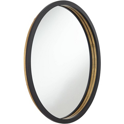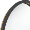 Designed by Noble Park, this modern round wall mirror is a sleek, understated choice for any room. It offers a simple silhouette with a slender metal frame with MDF backing. The frame adds a black finish with gold accents that add warm sophistication.