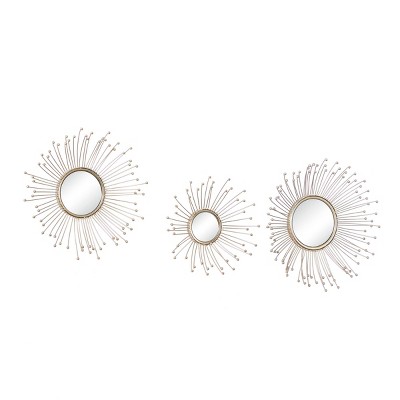 Add some elegance to your entryway, lobby, living room, or bedroom with this set of metallic sunburst wall mirrors. These accent pieces feature reflective glass mirror panels with gold thin frames and designed with gold-finished ball-tip rods that will surely beautify your space. These stunning mirrors suit any home with glam interior design. Apart from decorating your home, the purpose of these mirrors are to bounce back outdoor light to a small room to make it look bigger. Pair this set of decorative wall mirrors with house plants or other wall decor accent pieces to blend everything together perfectly. A loop hardware is placed at the back section for easy hanging via nail or screw. Suitable for indoor use only. These iron mirrors for wall comes in a set of 3. This item comes shipped in one carton.