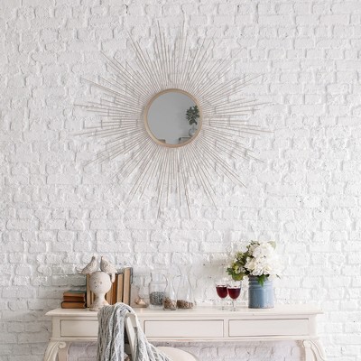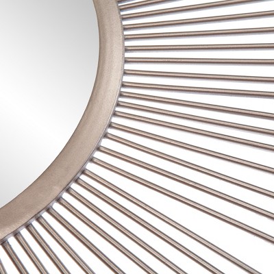 Add an eye catching statement piece to your space with the Champagne Rays Sunburst Metal Framed Wall Mirror. This starburst mirror features a soft champagne finish over its metal construction and alternating length spokes for a striking look. Round wall mirror measures 36 inches in diameter, making it the perfect addition to that empty wall you’ve been meaning to decorate.