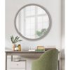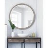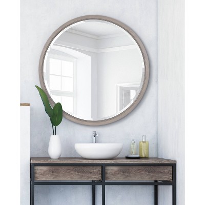 Create the coastal farmhouse of your dreams with this beautiful, high-quality wood wall mirror. The Hogan round mirror is a perfect display piece for creating vibrancy and dimension in your space, making the area appear more open and free-flowing. This mirror has a modern round shape with a bold graywash finish, reminiscent of art and decor pieces you’d find off the harbor of a New England beach town. The frame itself has a solid wood composition, giving it a robust, beautiful look and high-quality resiliency for multiple years of display. The 32-inch diameter makes it a striking visual focal point for a wide range of spaces. Use it as a large vanity mirror in your master bathroom or powder room or as a decorative statement on your mantle, over a console, or paired above your favorite pieces of furniture. The Hogan mirror hangs in a matter of minutes thanks to the metal D-ring hangers that are conveniently attached to the back. This coastal mirror is an excellent way to add sophistication to your coastal casual decor theme.