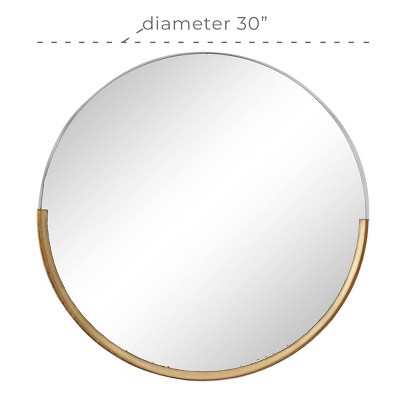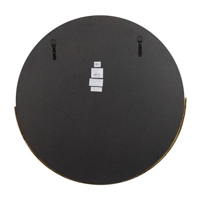 Style your living room space with this chic round mirror with metal frame. The small mirror, hand-crafted from India, measures 30″ in diameter and features a metallic gold-finished iron half-frame. The minimalist style works for living spaces and office room areas. It makes a great centerpiece over your sofa or in your dining room. Hang on walls together with other modern and contemporary accents. Ready to hang by hardware in back. Suitable for indoor use only. This item comes shipped in one carton.
