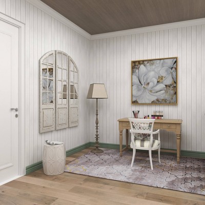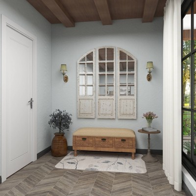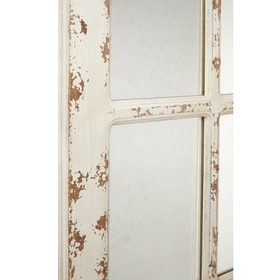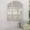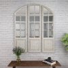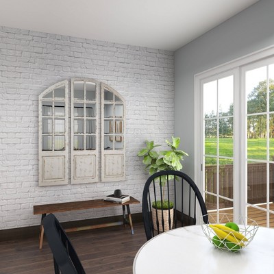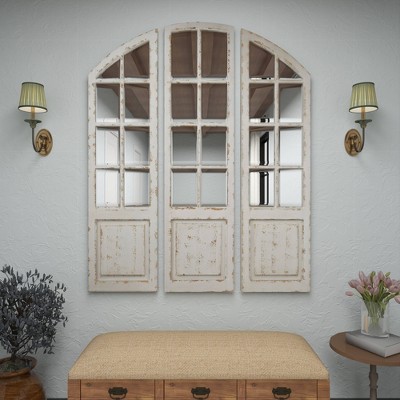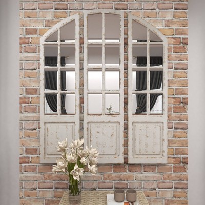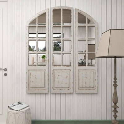 Bring bold vintage style and reflective light to your space with this large, 3-paneled, vintage white floor mirror. The arched silhouette, distressed antique white finish, and interior window frame around the mirrors add a textural vintage cottage look to your wall. The mirrors will reflect light, making your room or hallway feel bigger and brighter. The neutral white hue of the distressed wood frames with decorative carvings works with any color palette or wallpaper. Hooks on the back lets it hang with ease. Suitable for indoor use only. Each set comes with 3 white arched wall mirrors. This item comes shipped in one carton.