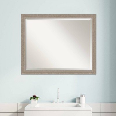 Give your bathroom the finishing touch with this 100% real wood framed wall mirror sized to fit above a standard bathroom sink. This vanity mirror features a curved frame with satin, gray wash finish accentuated by subtle, underlying woodgrain and brushed silver highlights. This decorative mirror is handmade in a small, custom art and frame shop in the American heartland. You will be proud to display it in your home.