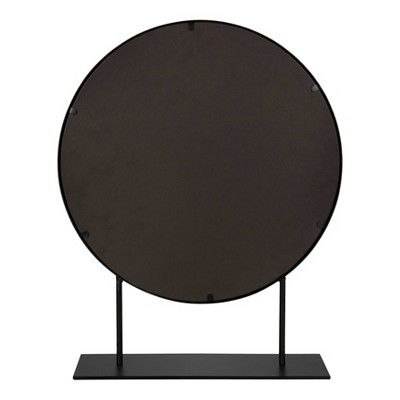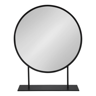 - The contemporary circular shape is supported by a sturdy base with a tabletop display dimension of 22-inches tall with 18-inch diameter mirror. Large enough to use for makeup application or as an extra bathroom mirror but small enough to be super convenient