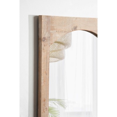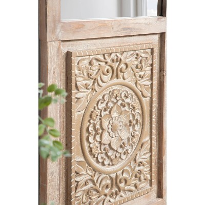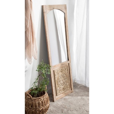 Elevate your home decor with this rustic accent piece that commands attention in any room. The Moynihan wooden panel mirror features a robust solid fir wood construction with a light whitewashing distressed by hand for a truly one-of-a-kind accent. What sets the Moynihan wall mirror apart from its contemporaries is the ornately carved medallion design on the lower half of the frame. This stunning visual is an excellent way to create a powerful statement and rustic presence in your home. As an oversized wall accent, the dimensions of this mirror are 55 inches tall by 17.5 inches wide, with a 1-inch depth for a slight dimension. Proudly display this mirror in any traditional or rustic farmhouse living room, bedroom, entryway, dining room, or stair landing. The Moynihan mirror is an excellent way to spread light throughout your home while bringing dimension to your smaller spaces. Hang it quickly in with convenient metal D-ring hangers securely attached to the back.
