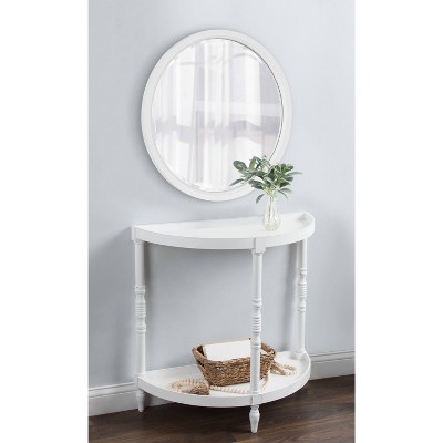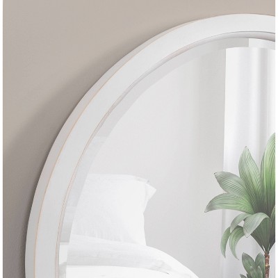 Create the coastal farmhouse of your dreams with this beautiful and high-quality wood wall mirror. The Hogan round mirror is a perfect display piece for creating vibrancy and dimension in your space, making the area appear more open and free-flowing. This mirror has a modern round shape with an airy, rustic white finish, reminiscent of art and decor pieces you’d find off the harbor of a New England beach town. The frame itself has a solid poplar wood composition, giving it a robust, beautiful look and high-quality resiliency for multiple years of display. The 24-inch diameter makes it a striking visual focal point for a wide range of spaces. Use it as a vanity mirror in your master bathroom or as a decorative statement on your mantle, console, or paired above your favorite furniture pieces. The Hogan mirror hangs in a matter of minutes thanks to the metal D-ring hangers that are conveniently attached to the back. This round mirror is an excellent way to add sophistication to your coastal casual decor theme.