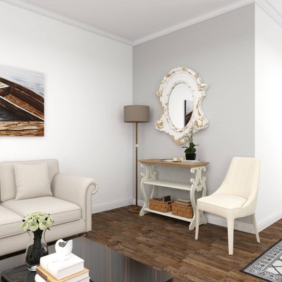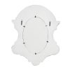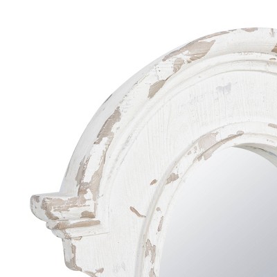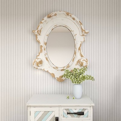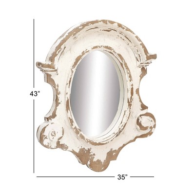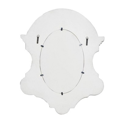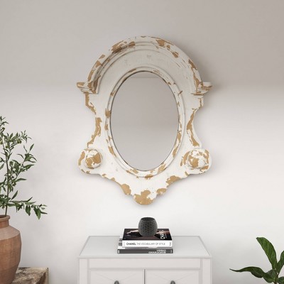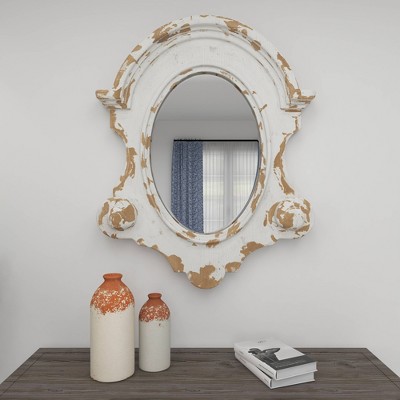 Very decorative with layers of texture, this large wall mirror features an antique frame shape painted antique white with heavy distressing. Decorative scrollwork flourishes are carved throughout the wood frame with a vintage emblem silhouette housing the oval mirror inlay. This white mirror is robust makes a great centerpiece over your sofa or in your dining room. Item features metal loop for easy and secure hang. Suitable for indoor use only. This item comes shipped in one carton.