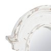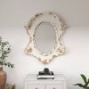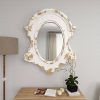 - A distressed mirror for wall has an oval glass at the center and scalloped ornate moldings