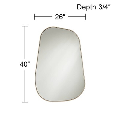 Grab attention and engage in a casual space with this whimsical framed wall mirror. A fun silhouette features an oblong rectangular shape with asymmetrical curved corners, adding personality in a living area, entryway, or bedroom space. A champagne gold finish slender frame hosts a pane of non-beveled glass, as MDF wood backing completes its construction details. Vertical installation only.