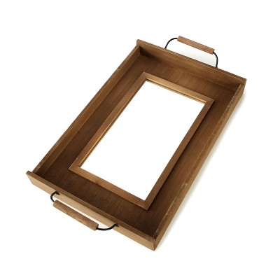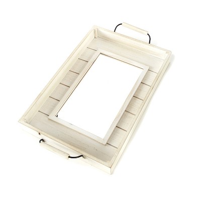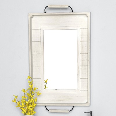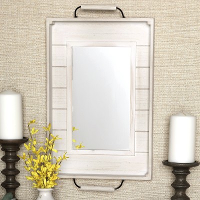 Give your farmhouse wall dรฉcor a finishing touch with this rustic wooden mirror. The wood of the white choice looks like shiplap, while natural’s wood is smooth. Designed to resemble a serving tray, this decorative wall mirror has handles at top and bottom. It’s perfect as bathroom wall dรฉcor, living room dรฉcor or wall dรฉcor for the entryway. Hanging in the entryway, this rustic wall mirror is just the right size for checking your hair and face before leaving the house. 12″W x 18″L. MDF and glass. Hangs by sawtooth hanger.