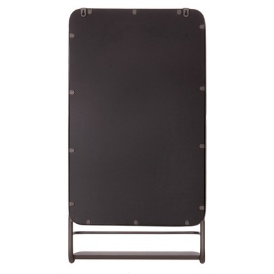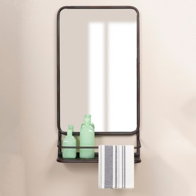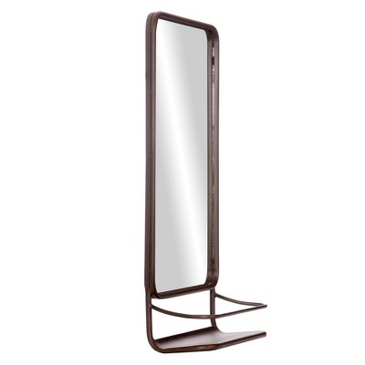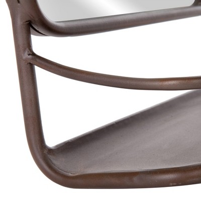 Add a clean modern element to your decor with this Bronze Metal Wall Accent Mirror with Shelf. This modern mirror is sleek and elegant with it’s metal piping frame in a bronze finish. Lower shelf is perfect for displaying decorative accent, candles or use it as a bathroom vanity mirror. This playful modern design is a stand out decor piece for your space. It measures 29.5 inches tall x 16 inches wide and hangs securely to any wall with industrial hangers on the back. Shelf detail is 4.5″ deep. Mirrors provide the illusion of a larger space while also adding bright reflective shine. This mirror is no exception with it’s unique modern design.